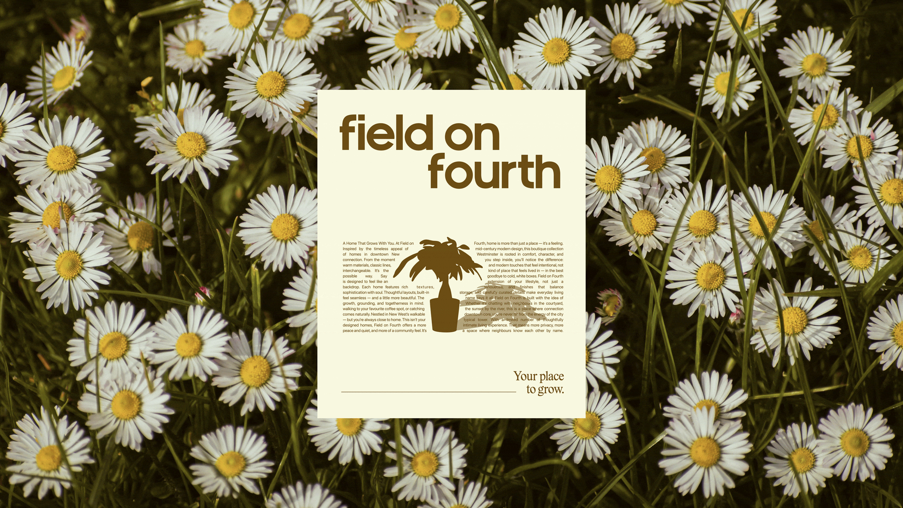The brand identity reflects this balance. A warm, grounded palette pairs with heritage-inspired typography and hand-drawn furniture illustrations, adding a sense of familiarity and care. Every design element is intentional, from the messaging to the materials, reflecting values of community, sustainability, and meaningful urban living. Field on Fourth is not just built for now. It is designed to last.