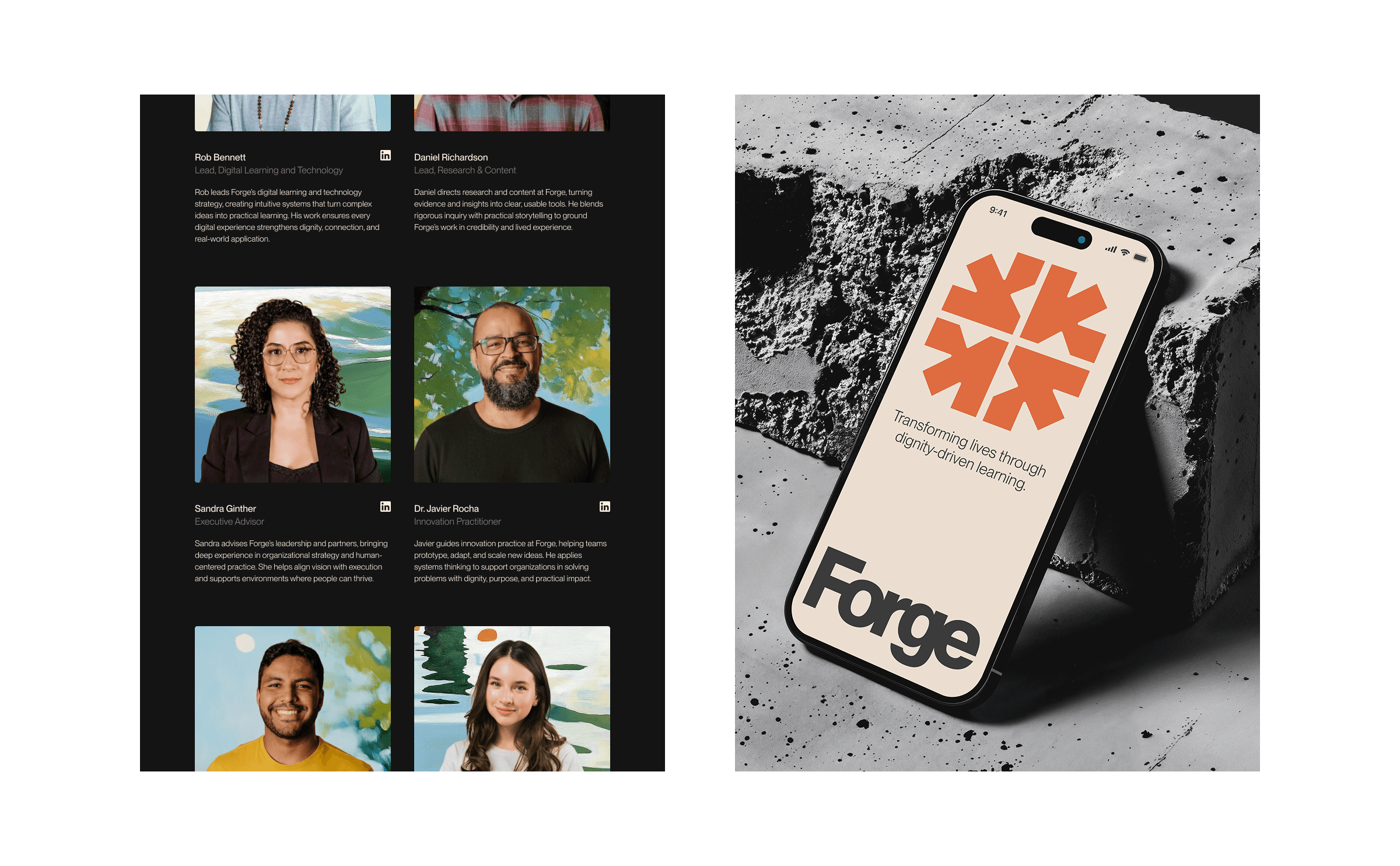 When Forge approached us, they were shaping an ambitious vision: a learning-focused, practice-driven community where leaders and practitioners could build the skills, relationships, and shared language needed to create more just and connected systems. They needed a brand that could hold all of that—clarity without rigidity, warmth without softness, and a sense of coherence in the midst of real-world complexity.